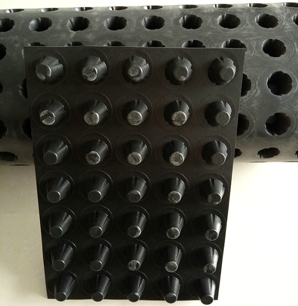 圓錐突臺(或中空圓柱形多孔)的塑膠底板,由高抗沖聚苯乙烯(HIPS)制成。圓錐突臺(或中空圓柱多孔)的頂面膠接一濾層土工布,以阻止泥土微粒通過,從而避免通道阻塞,使孔道排水順暢。